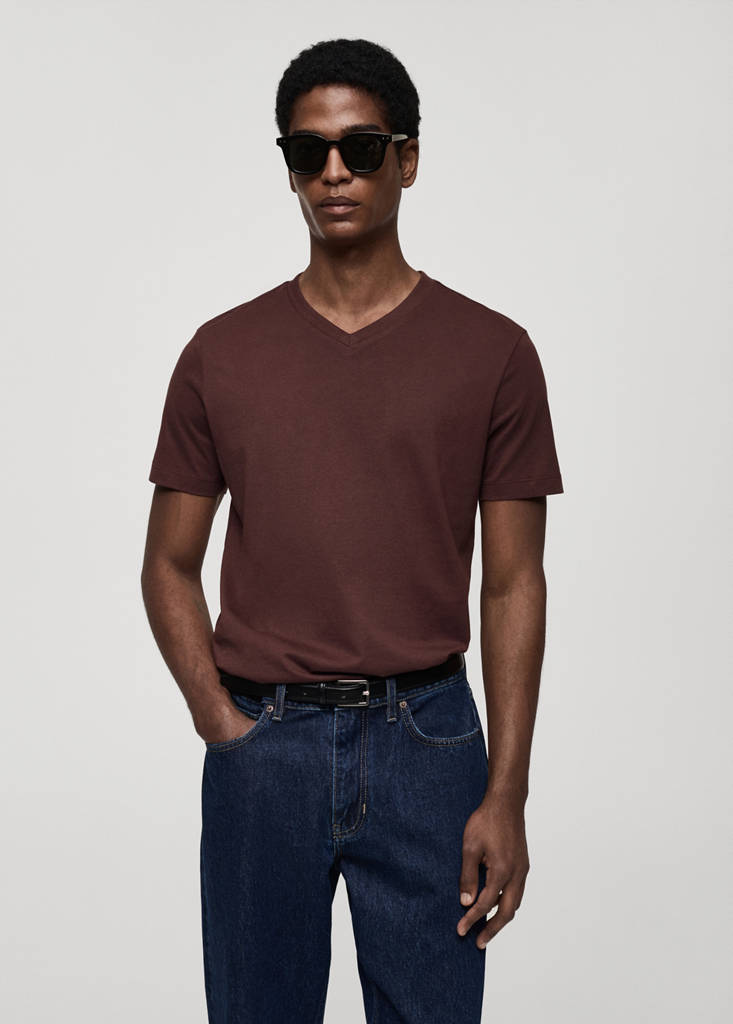 Slim fit. 100% cotton fabric. V-neck. Short sleeves. Straight hem. The sand and crimson models are online exclusives. The medium brown and green models are online exclusives. The medium brown and indigo blue models are online exclusives. Short sleeves