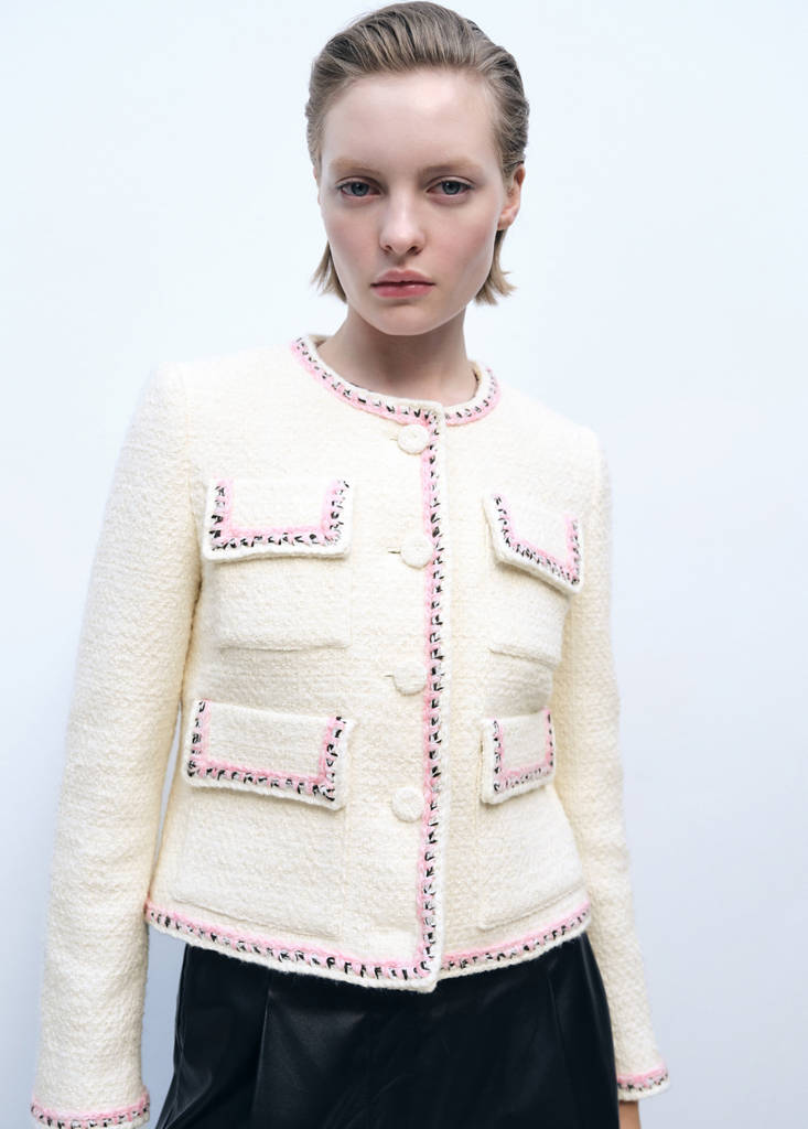 Tweed fabric. Straight design. Round neck. Long sleeves. Four patch pockets with flaps at the front. Contrast trims. Front closure with buttons. Inner lining