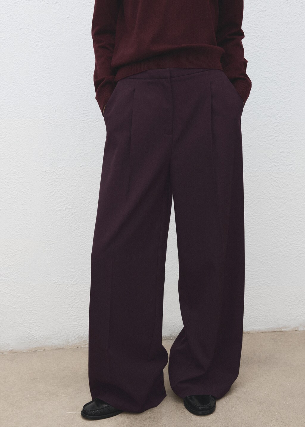 Wide-leg mid-rise pleated trousersCurrent price [฿ 2,290.00 ]฿ 2,290.00Select a colourMaroonSelect your size32Delivery in 10 to 15 working days34Delivery in 10 to 15 working days36Delivery in 10 to 15 working days38Delivery in 10 to 15 working days40Delivery in 10 to 15 working days42Delivery in 10 to 15 working days44Delivery in 10 to 15 working daysSize guideAddAdd to your wishlistSee lookConvenient home deliverySee availability in storeDescriptionLong design. Wide-leg design. Mid-rise. Dart detail. Two side pockets. Welt pocket on the back. Concealed button, hook and zip front closure with placket. Inner lining.See detailsShare