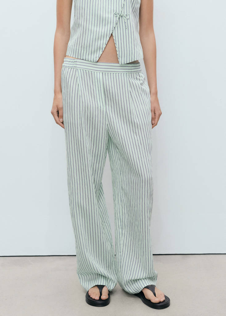 ดีไซน์ยาว. ดีไซน์ขากว้าง. ลายทาง. เอวปานกลาง. เอวยางยืด. กระเป๋าข้างสองใบ. ไม่มีการปิด. Total look