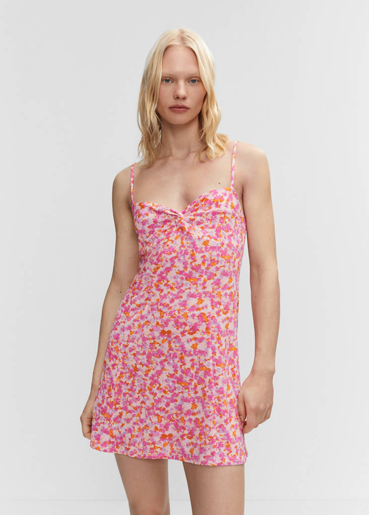 Tissu fluide. Coupe droite. Coupe courte. Imprimé floral. Décolleté cœur. Bretelles fines. Sans fermeture
