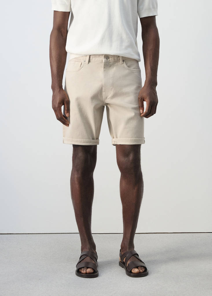 Fabriqué en tissu de coton, ce bermuda slim est doté de passants de ceinture et d'une fermeture à bouton et zip. Il comprend deux poches latérales, une poche ticket et deux poches plaquées à l’arrière. Les bermudas sont dotés d'un ourlet sur le bas. Le mannequin mesure 190 cm et porte une taille 42