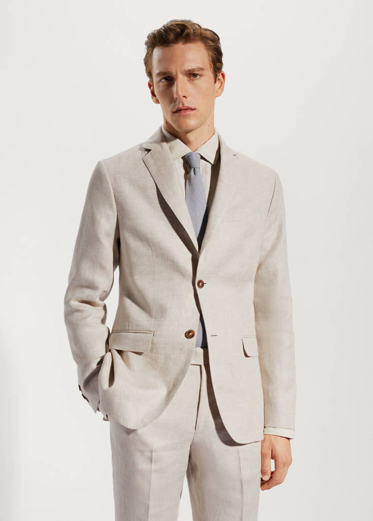 Slim fit. Tissu en lin mélangé. Coupe standard. Revers crantés. Manches longues et poignets boutonnés. Poche passepoilée sur la poitrine. Deux poches à rabat sur le devant. Ourlet droit. Double ouverture au dos. Doublure. Trois poches intérieures. Collection tailleur. Fermeture avant avec boutons. Tissu 100 % lin. Tissu léger. Collection Essentiels