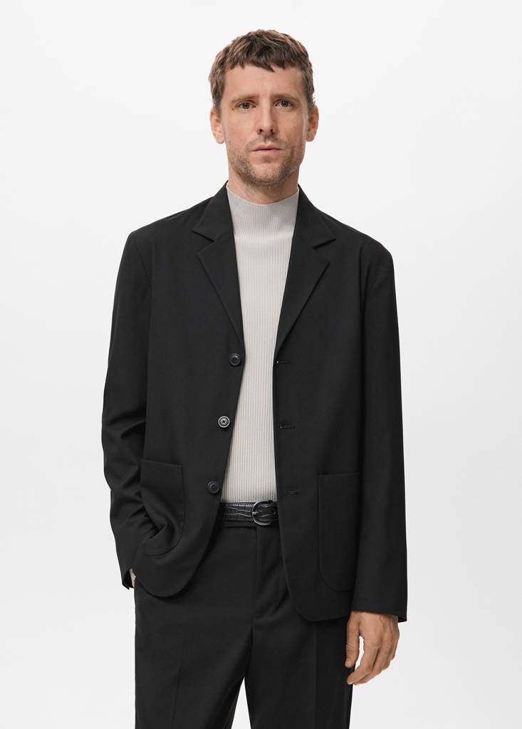 Collection fête et événements. Tissu viscose. Silhouette droite. Deux poches plaquées sur le devant. Fermeture avant avec boutons. Manches longues avec poignet à lanière boutonnée. Ouverture arrière en bas