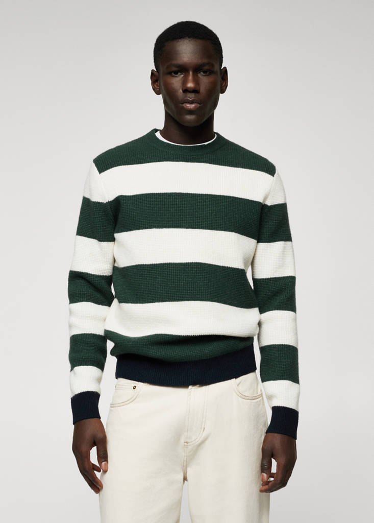Motif rayé. Col rond. Manches longues. Bords contrastants. Le mannequin mesure 187 cm et porte une taille M