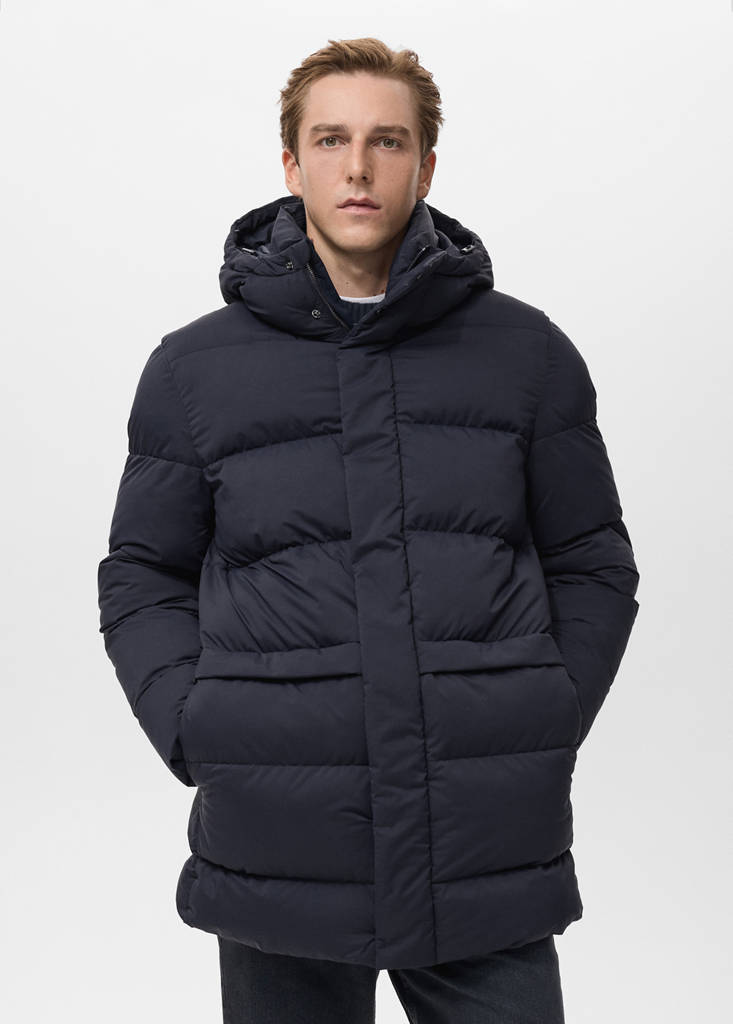 Silhouette droite. Design matelassé. Water Repellent : Tissu technique déperlant. Capuche avec cordon de serrage. Col cheminée intérieur en maille. Côtes à l'intérieur des poches et du col. Deux poches latérales. Fermeture Éclair et boutons à l’avant