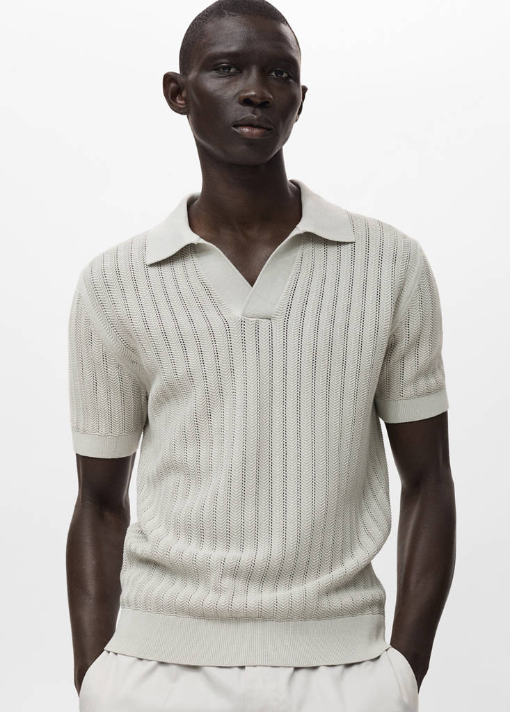 %100 pamuk kumaş. Düz siluet. Balık sırtı desenli ajur örgü. Düğmesiz polo yaka. Yaka, kollar ve uç kısmı ribana. Kısa kol. Düz etek ucu