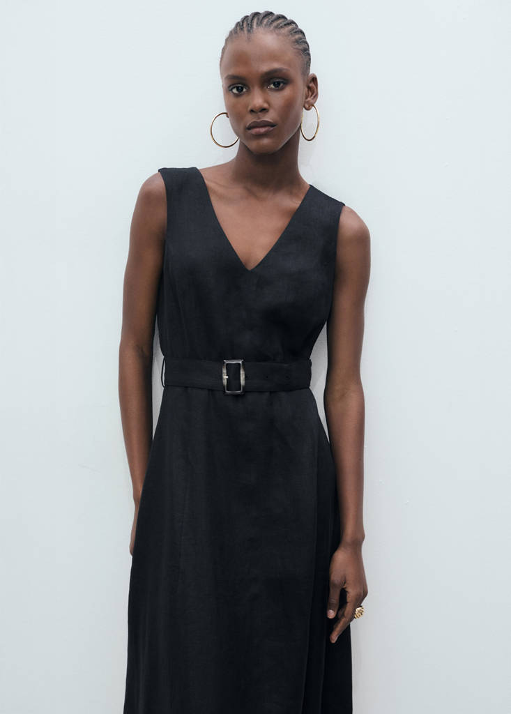 %100 keten kumaş. Midi boy. Düz kesim tasarım. V yakalı. Kolsuz. Geniş askılar. Kemer halkaları. Kemer toka kapamalı. Arka kısımda fermuar kapama