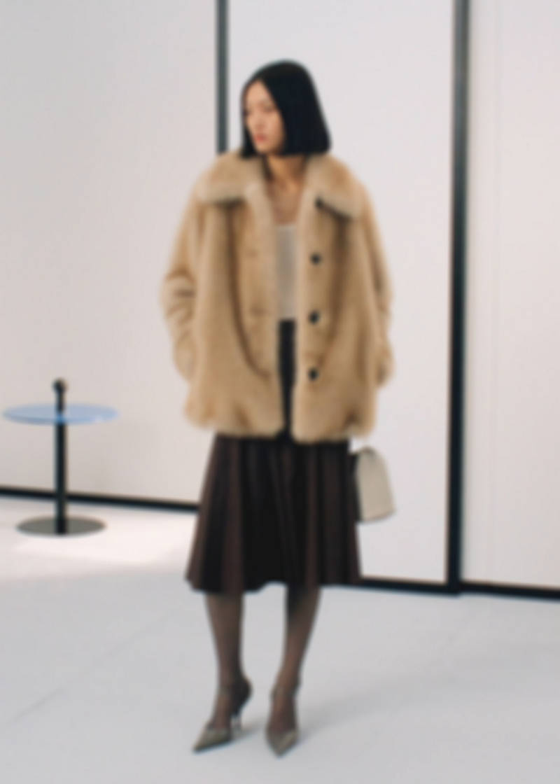 Düz tasarımlı ve kürk görünümlü bu palto, gömlek yaka ve uzun kollara sahiptir. Ön kısmındaki düğmeli kapama ve iç astar rahatlık sağlar. Sadece online satışa özeldir