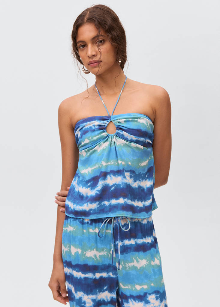 Viskon kumaş. Batik kumaş. Kısa tasarım. Düz tasarım. Boyundan bağlamalı. Göğüs kısmında dairesel yırtmaç detayı. Açık sırt. Total look. Promosyonlu Ürün