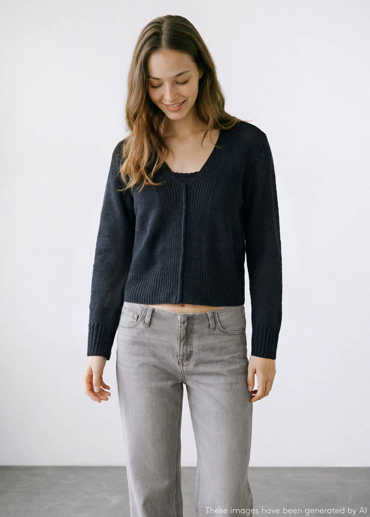Pamuk karışımlı kumaş. Düz tasarım. Dikiş detayları. Orta kalınlıkta triko. V yakalı. Uzun kollu. Ribana detaylar