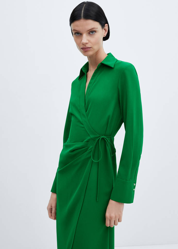 Fluid fabric. Midi design. Wrap design. Shirt collar. Long sleeves with buttoned cuffs. Tie fastening. Office looks