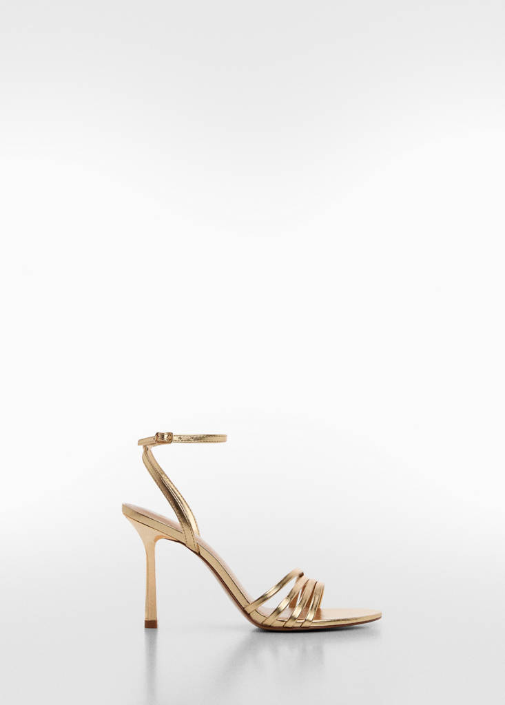 Straps design. Metallic finish. Front opening. Stiletto heel. 8.5 cm heel. Buckle closure