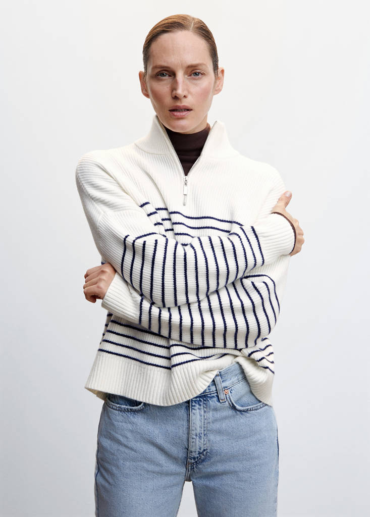 Chunky knit fabric. Straight design. Striped print. High neck with zip closure. Long sleeves. Dropped shoulder seams. Cable knit finish. Available Plus. The colours dark navy blue, black, sand and green are online exclusives. High collar. Neck closure. Oversized design. Standard design. Perkins neck with zip. This garment belongs to our Gift Guide