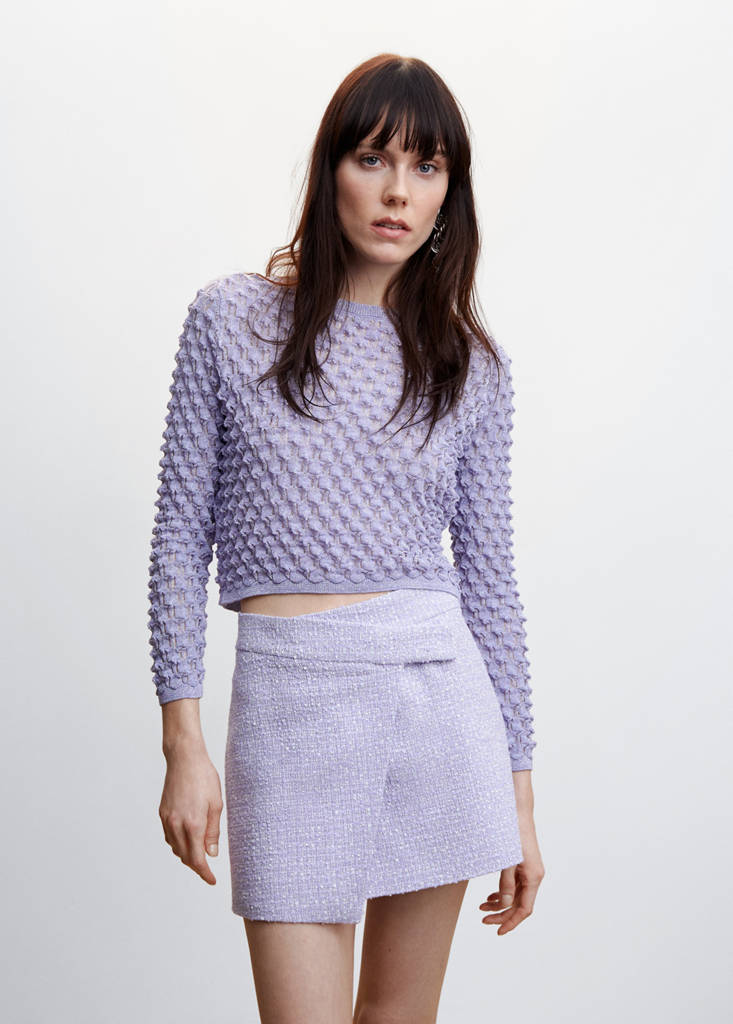 Fine knit fabric. Textured fabric. Straight design. Cropped design. Rounded neck. Long sleeve. Unclosed. Festival Season