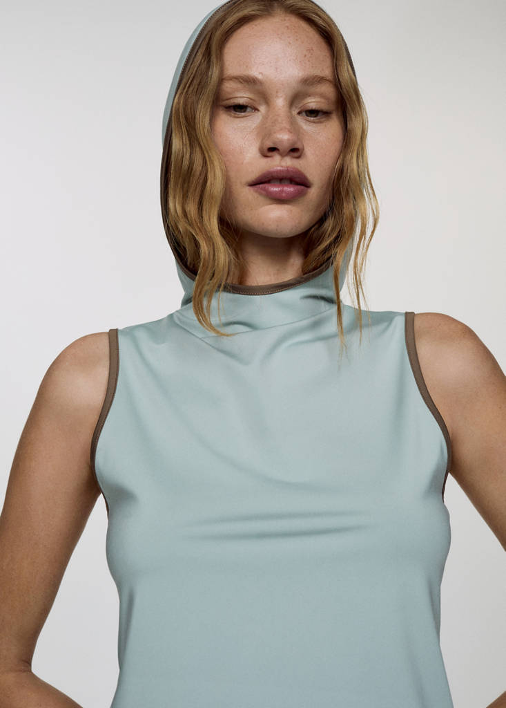 Stretch fabric. Round neck. Sleeveless. Hood. No Fastening. Contrasting finishes. Fitted design