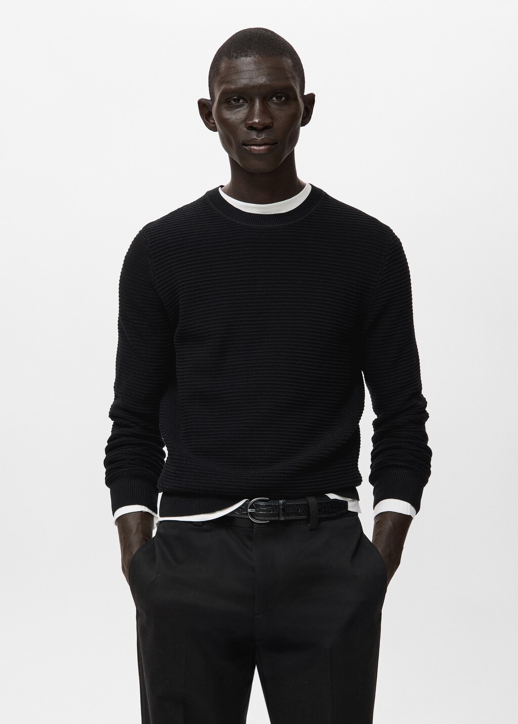 New Now100% cotton braided sweaterCurrent price [US$ 79.99 ]US$ 79.99Select a colourBlackSelect your sizeSMLXLXXLSize guideAddAdd to your wishlistSee lookFree delivery to storeSee availability in storeDescriptionRegular fit. 100% Cotton. Braided design. Round neck. Long sleeve. Ribbed collar, cuffs and hem.See detailsShare