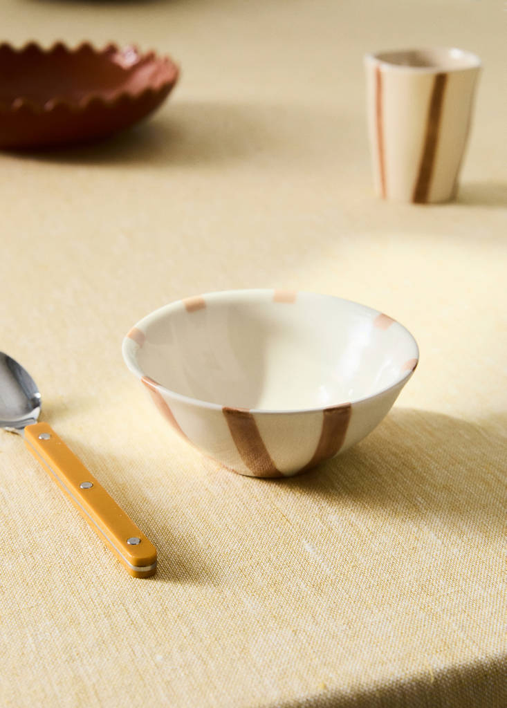 Made in Portugal / HANDPRINTStriped gres bowlCurrent price [грн. 449.00 ]грн. 449.00Select a colourVanillaSelect your sizeOne sizeAddAdd to your wishlistSee lookFree delivery to store100% stoneware. Diameter: 11.5 cm. Height: 11.5 cm. Striped design. Microwave safe. Dishwasher safe. Coordinates with more products from the collectionDetails, composition and careStore availability