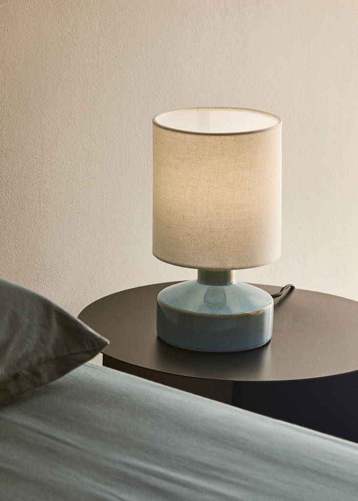 Diameter: 17 cm. Height: 28 cm. Table lamp with ceramic base in reactive glazed finish. Linen lampshade. Two-tone design. Available in different colours. Compatibility: Compatible with standard bulbs (not included), allowing you to customise the light intensity according to your needs. Easy Installation: Includes a plug for a simple and quick connection.. Operates with a 250V 4A bulb