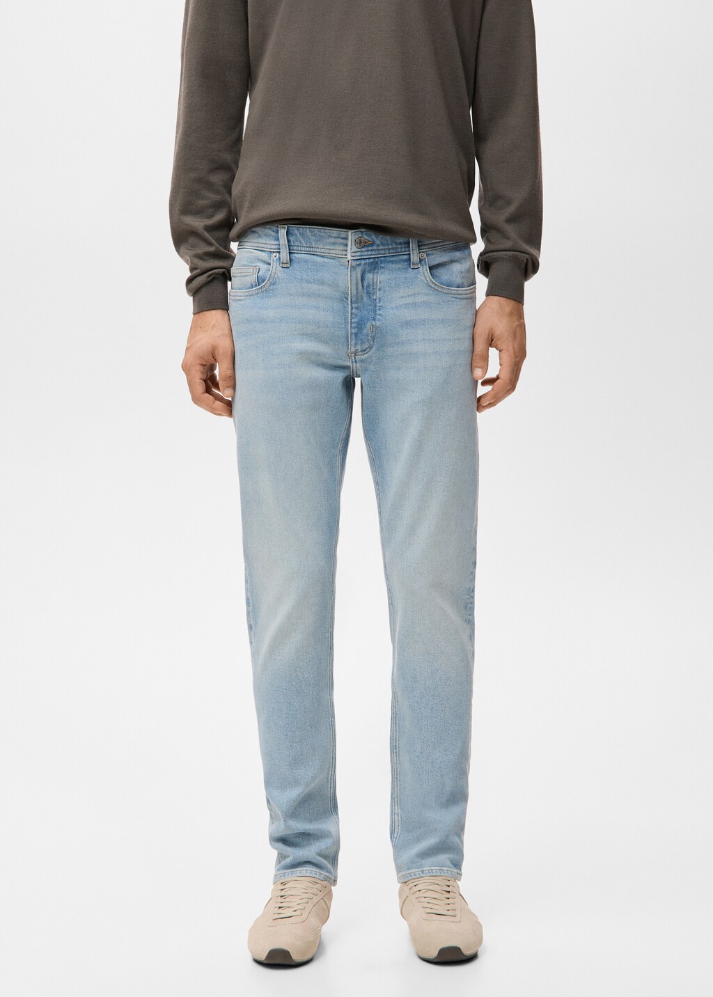 Slim fit. Cotton fabric. Light faded wash. Coin pocket. Two front pockets. Two patch pockets at the back. Button and zip fastening. Denim-style cotton fabric. Denim jeans style. Side pockets. Five pockets. Standard Length. Slim Silhouette. Regular Waist.
