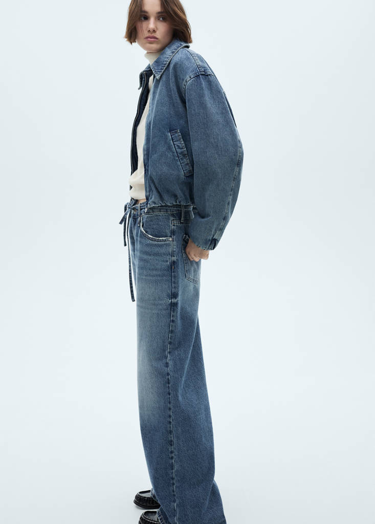 Denim-style cotton fabric. Bomber design. Crop design. Shirt collar. Long sleeves with elastic cuffs. Side pockets. Zip fastening on the front section