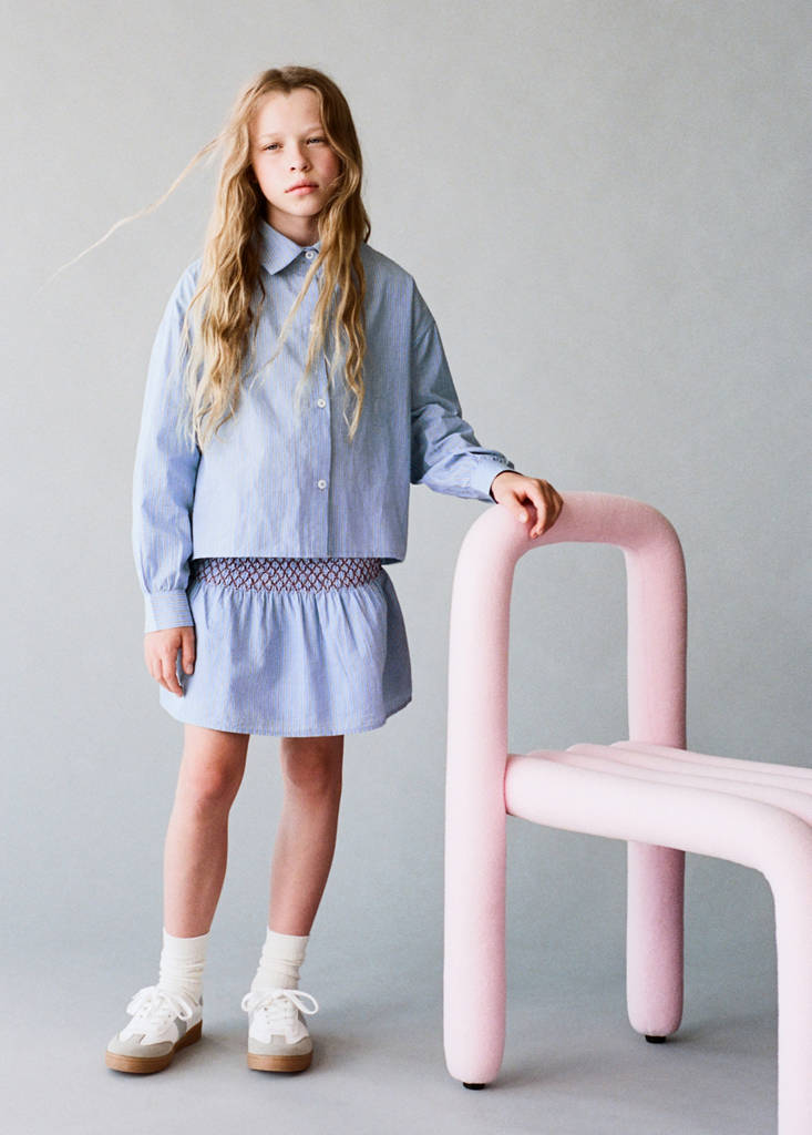 Виготовлена з бавовняної тканини, ця спідниця має дизайн у смужку без застібки. Її розкльошений силует доповнюється еластичною зібраною талією та вишитою деталлю, ідеально підходить для total look