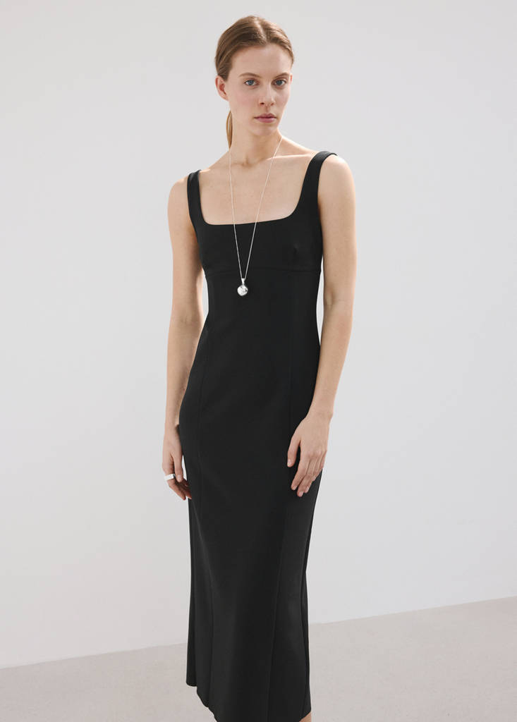 Дизайн міді. Приталений дизайн. Прямий виріз. Без рукавів. Тонкі бретелі. Розріз ззаду внизу. Спина з вирізом. Без застібки