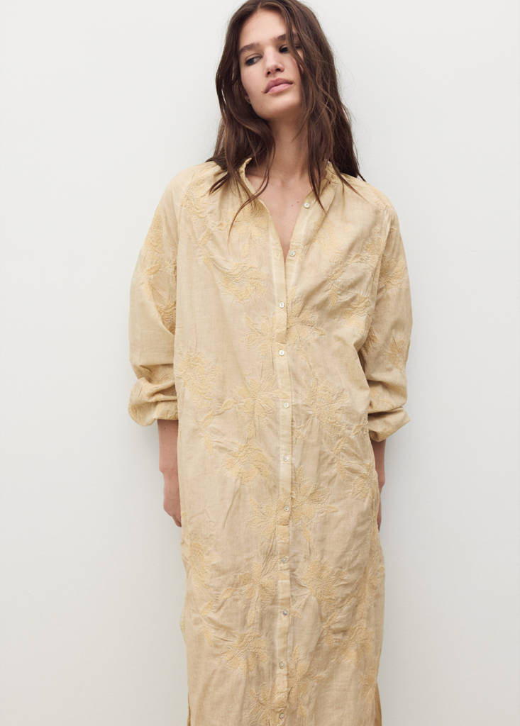 100% бавовна. Дизайн міді. Легка тканина. Комір сорочкового типу. Застібка на ґудзики. Довгі рукави. Вишиті деталі. Бічний розріз. Нижня частина сукні трохи розширюється, створюючи елегантний і струмливий ефект. Забезпечує комфорт і свободу руху