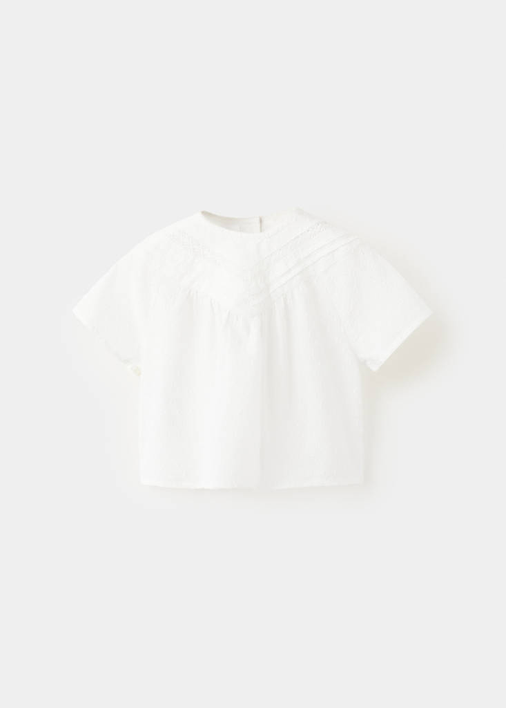 Тканина 100% бавовна. Прямий крій. Круглий виріз. Короткий рукав. Застібка на ґудзики ззаду. Вишиті деталі