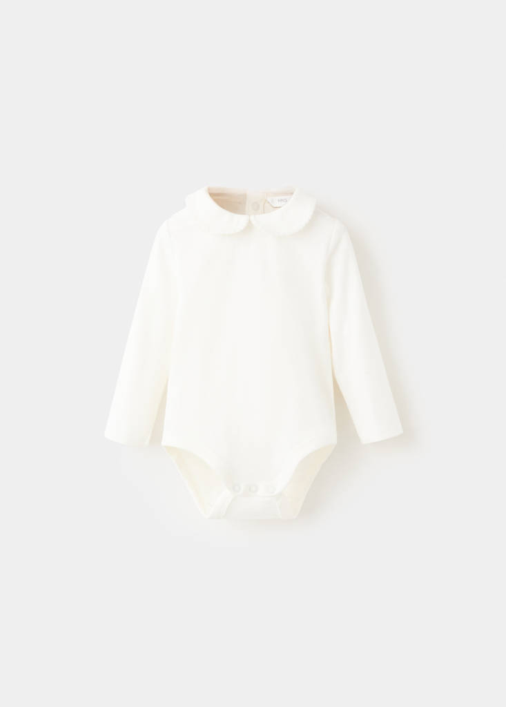 Тканина з бавовняної суміші. Приталений дизайн. Дизайн боді. Комірець "бебі". Круглий виріз. Довгі рукави. Застібка на ґудзики ззаду. Застібка на кнопки. Вишивка на комірі