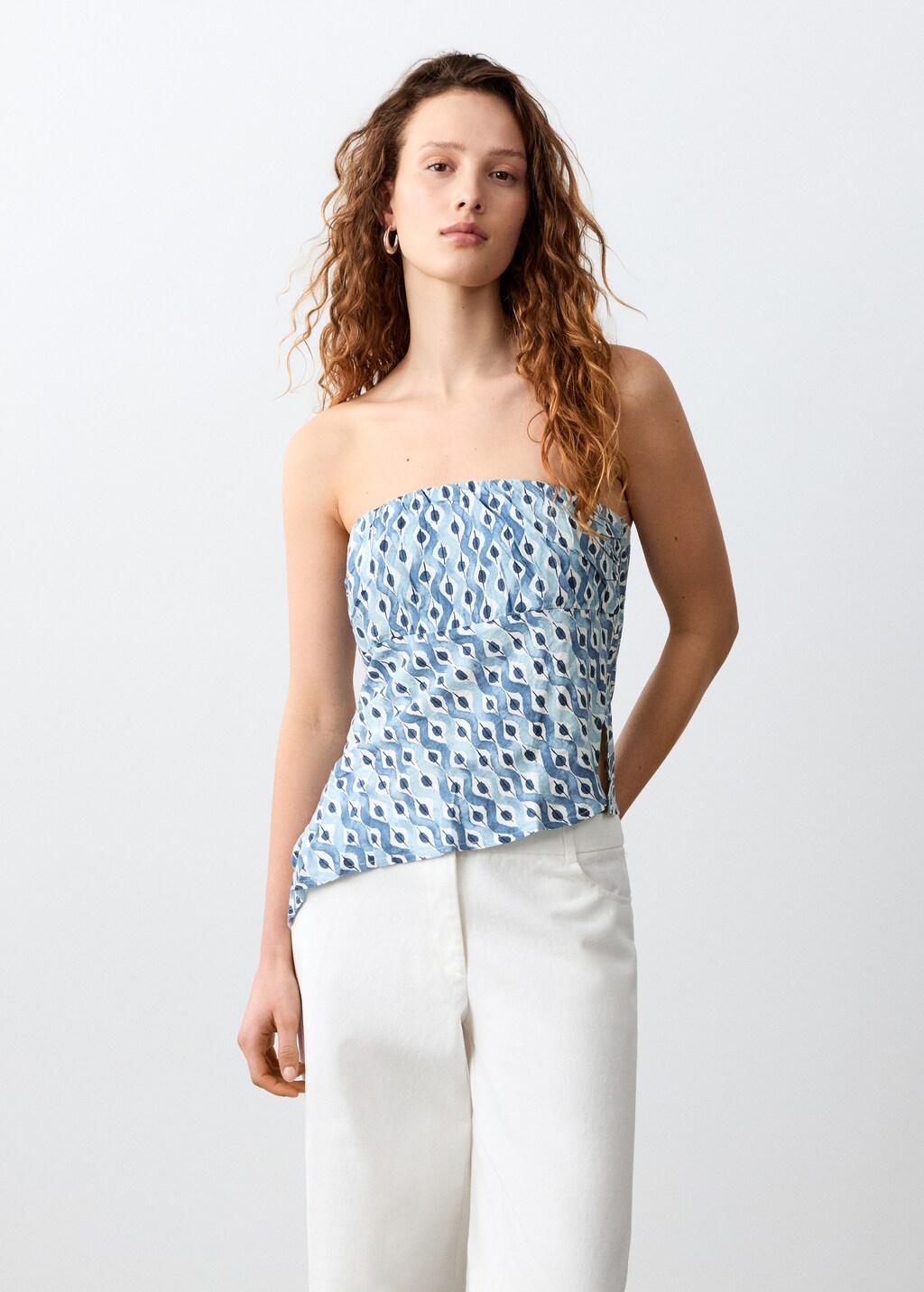 Тканина з лляною сумішшю. Асиметричний дизайн. Дизайн з принтом. Виріз "бандо". Бічна застібка-блискавка. Total look.