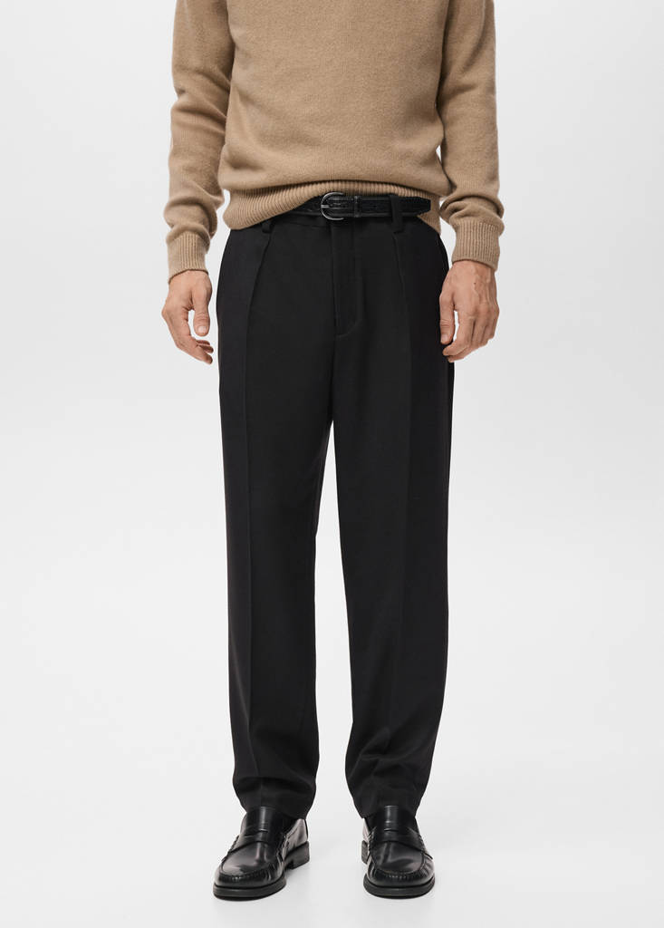 Колекція для свят і заходів. Стандартний крій. Тканина зі змішаного бавовни та віскози. Складки спереду і ззаду. Дві бокові кишені. Дві кишені з клапанами ззаду. Шльовки для ременя. Переднє застібання на блискавку та ґудзик