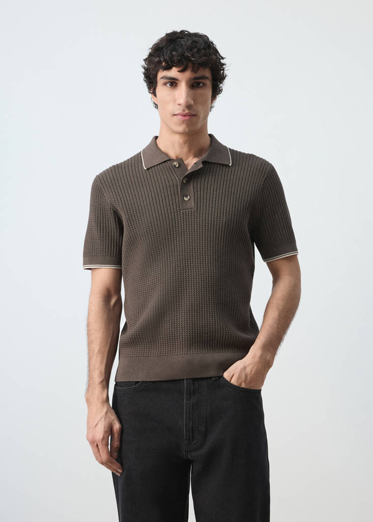 Тканина з бавовняної суміші. Фактура з тонкого плетеного трикотажу. Стандартний крій. Стандартна довжина. Поло комір із застібкою на ґудзики. Комір, рукави та низ з обробкою в рубчик. Контрастний акцент на комірі та рукавах