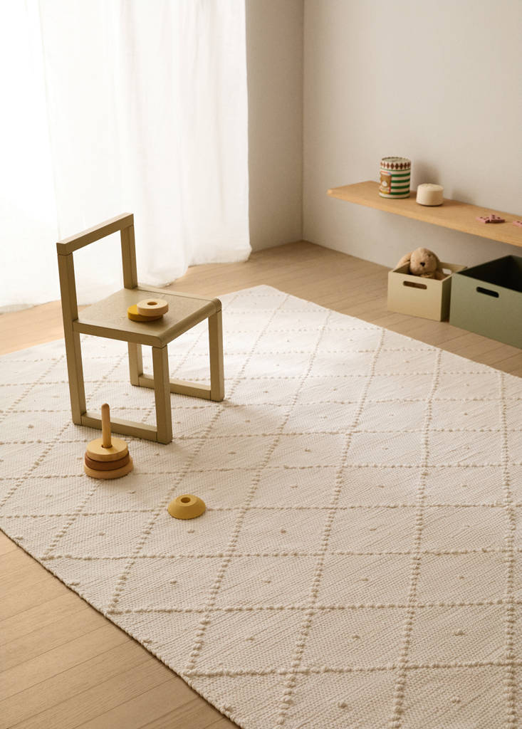 100% бавовна. Розмір: 90x150см. Дитячий килим з бавовни з ромбовим дизайном і помпонами, ідеальний як декоративний аксесуар, що створює затишну та мінімалістичну атмосферу. Його дизайн має візерунок переплетених ромбів, що додає витончену і елегантну візуальну текстуру