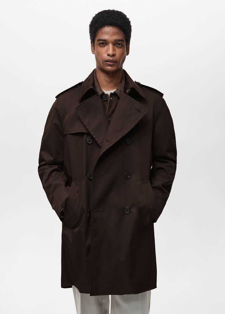 ESSENTIALS: Made to last. Water-repellent: The durable finish of this garment protects against light rain, repelling contact with water and raindrops. Cotton blend fabric. Water-repellent fabric. Design with double-breasted front closure. Inner lining. Shirt collar. Decorative shoulder straps. Notch lapels and buttonhole. Metal hook closure on the neck. Removable belt at the waist. Inner counterbutton for better grip of the outer button. Two front welt pockets. Long sleeves with adjustable loops. Elegant and classic style