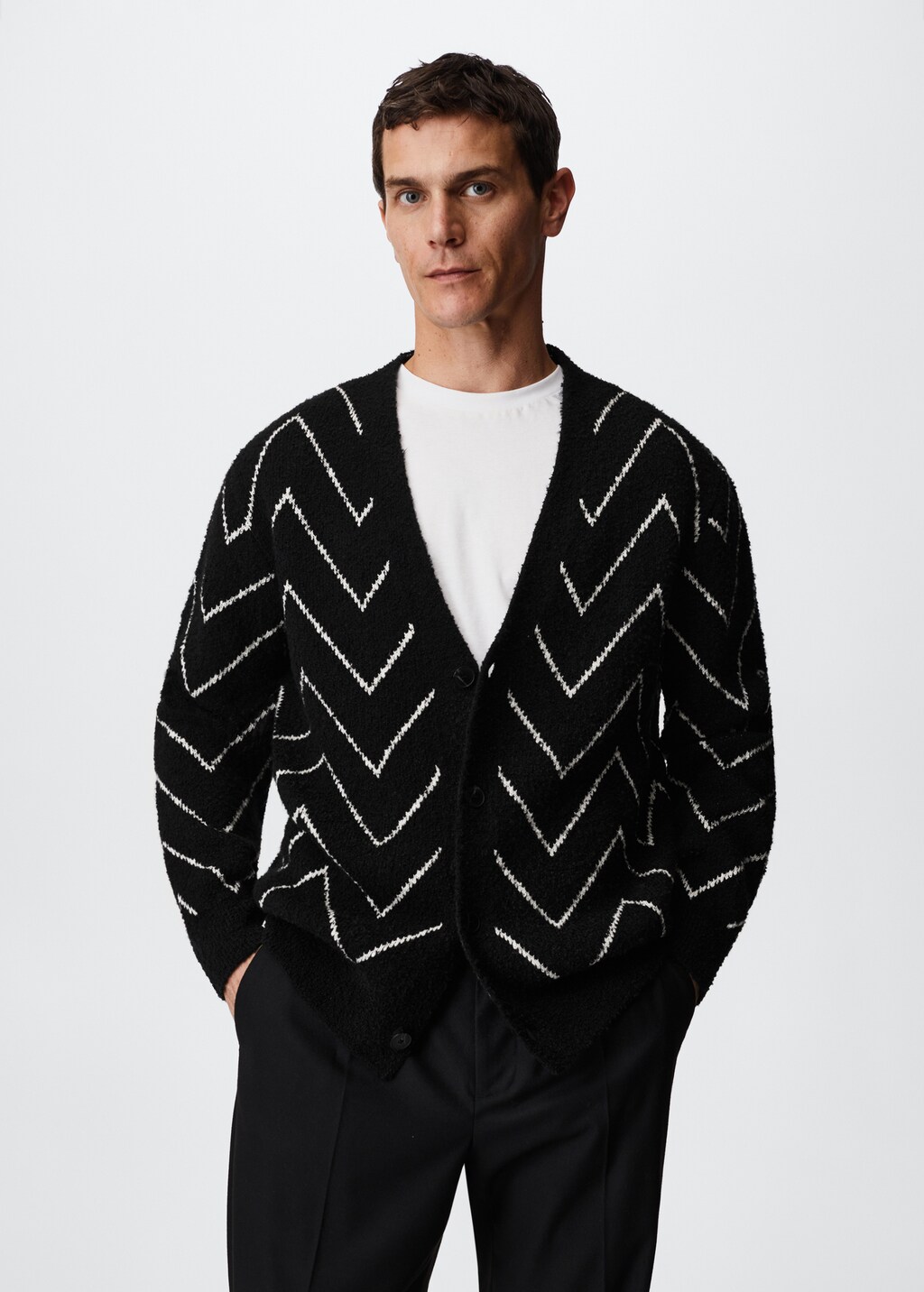 Cotton-blend fabric. Fabric with wool. Jacquard. V-neck. Long sleeve. Button up. The model is 6'1" and is wearing a size M.