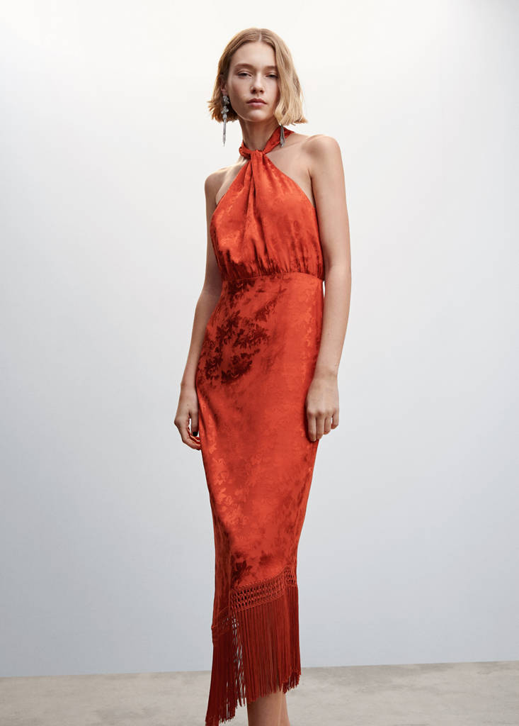 Jacquard. Flowy fabric. Midi design. Halter neck. Wrap collar. Back closure. Fringed finish. Side zip fastening. Party and events collection