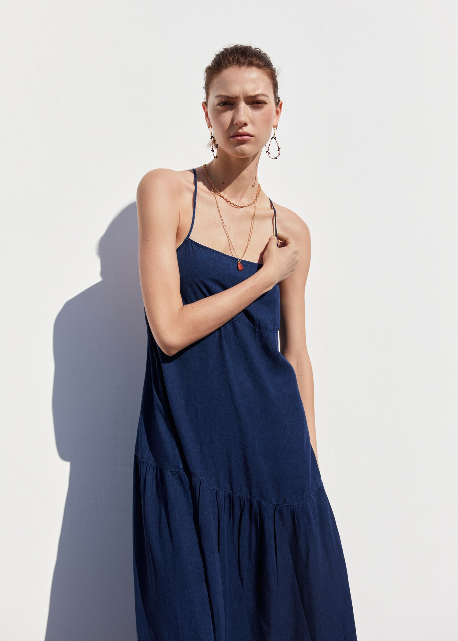 100% lyocell. Flowy fabric. Long design. Evasé design. Square neckline. Thin straps. Flared hem.