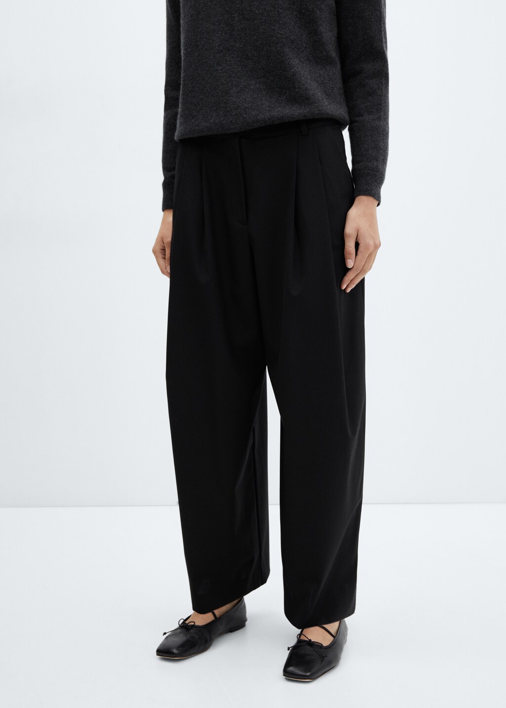 Wool mix fabric. Wide-leg design. Medium waist. Loops. Two side pockets. Two welt pockets on the back. Concealed button, hook and zip fastening. Dart detail. Inner lining.