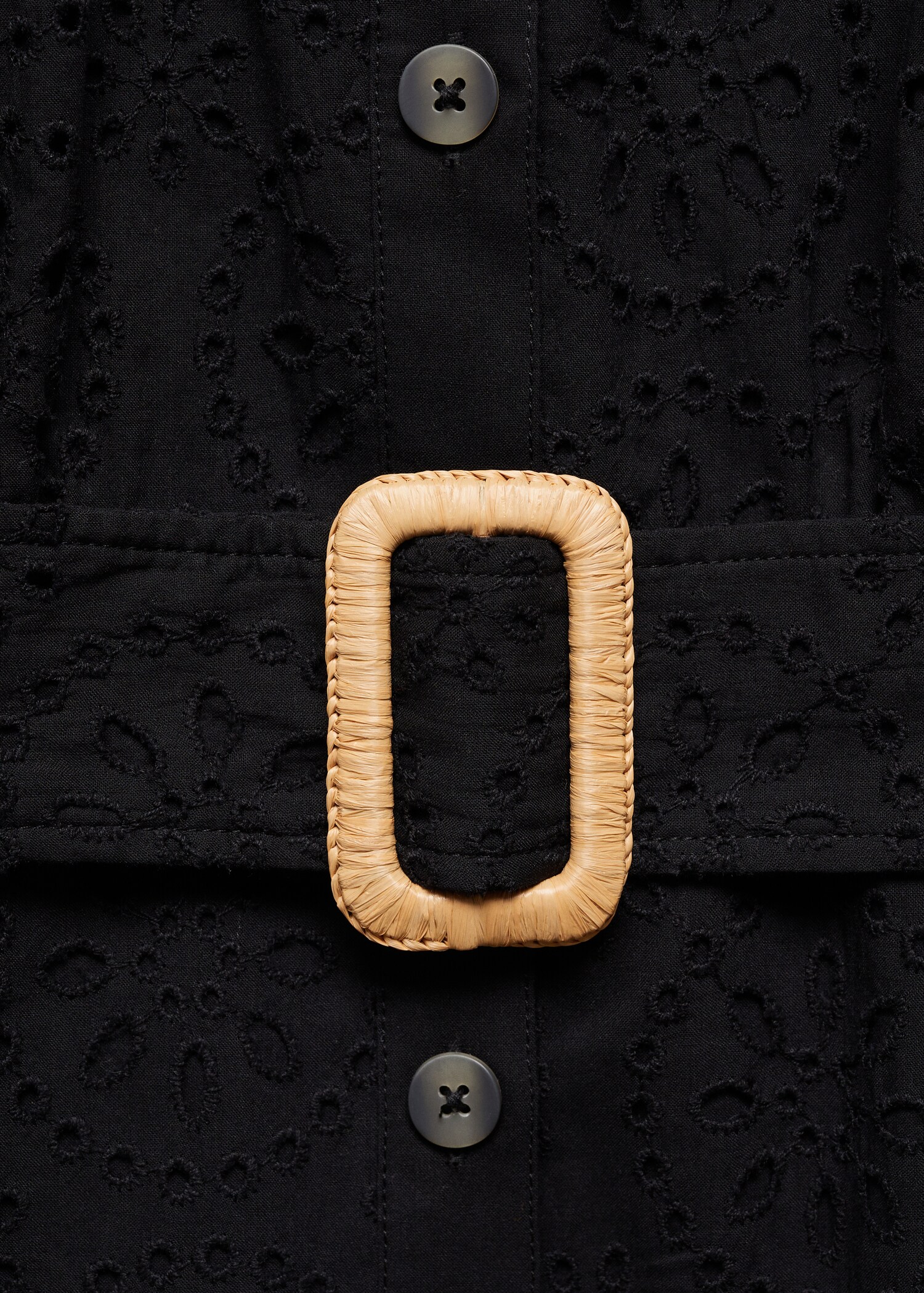 Embroidered fabric. Straight design. Short design. Shirt collar. Long sleeve. Decorative front flaps. Belt loops. Adjustable belt. Inner lining. Available in Plus sizes. 100% cotton fabric. Front button closure.