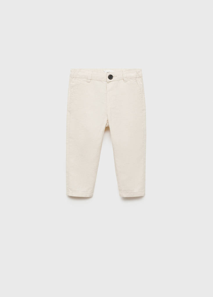 Cotton and linen fabric. Straight design. Chinos style. Two front pockets. Two welt pockets at the back. Belt loops. Elastic waistband. Button and zipper fastening. Party, ceremony, and communion collection