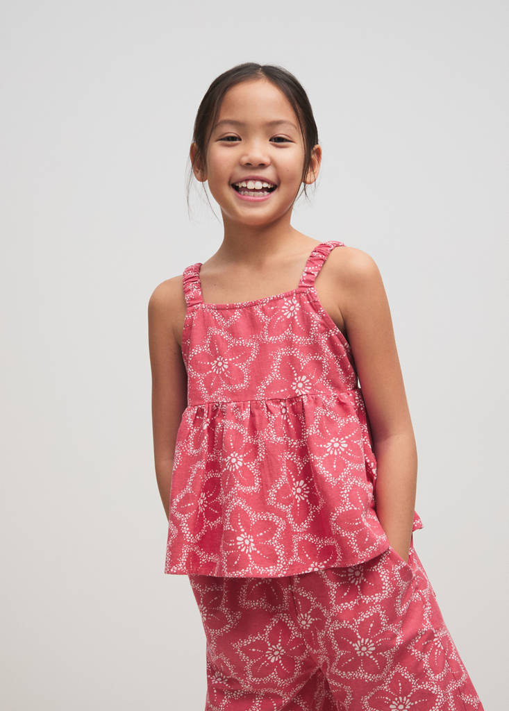Fabric with linen. Ruffle hem. Floral print. Ruched straps. Back slit detail. Total look