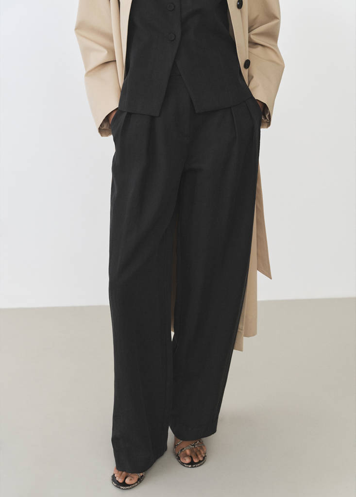 Lyocell fabric. Long design. Straight design. Suit style. High-rise. Two side pockets. Button, hook and zipper front closure. Inner lining. Total look