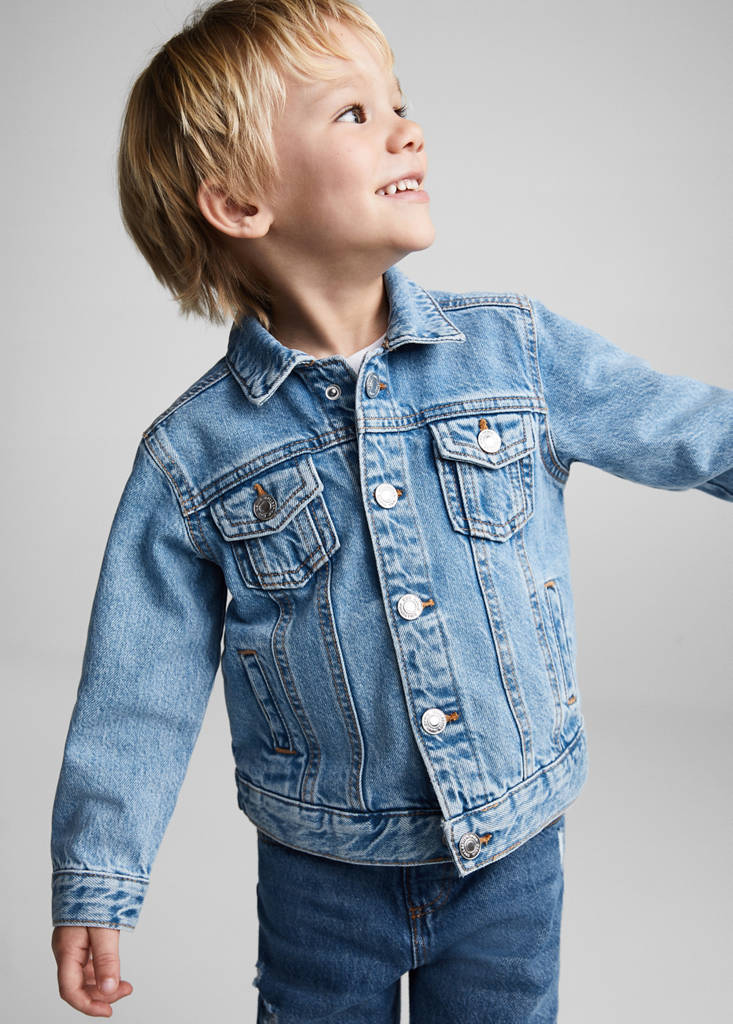 Cotton denim jacketCurrent price [US$ 39.99 ]US$ 39.99Select a colourLight BlueSelect your size9-12 (31in)Not available. I want it!12-18 (33in)Not available. I want it!18-24 (36in)Not available. I want it!2-3 years (39in)Not available. I want it!3-4 years (41in)Not available. I want it!4-5 years (43in)Not available. I want it!DimensionsNotify meAdd to WishlistSee lookFree shipping to storeDenim-style cotton fabric. Straight design. Shirt collar. Jeans with tie closure. Long sleeves. Button closure. Snap button closureDetails, composition and careStore availabilityMango StylistAsk about deliveries, returns and moreAssistant