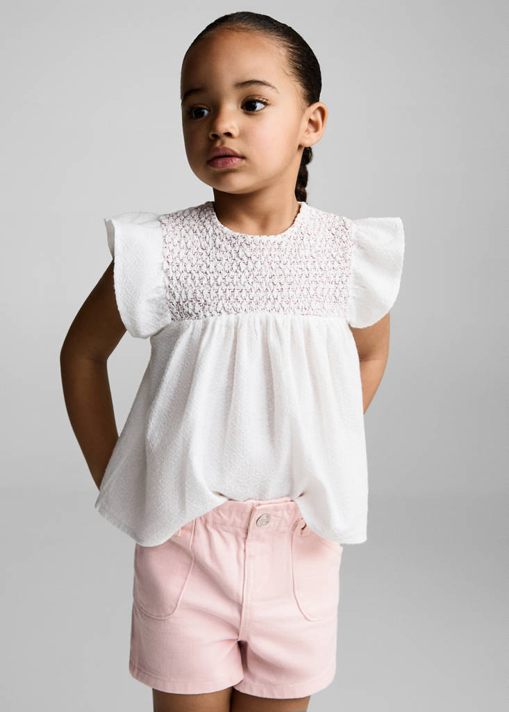 Denim-style cotton fabric. Straight design. Short design. Belt loops. Two side pockets. Two patch pockets at the back. One press stud fastening. Elastic paper bag waistband