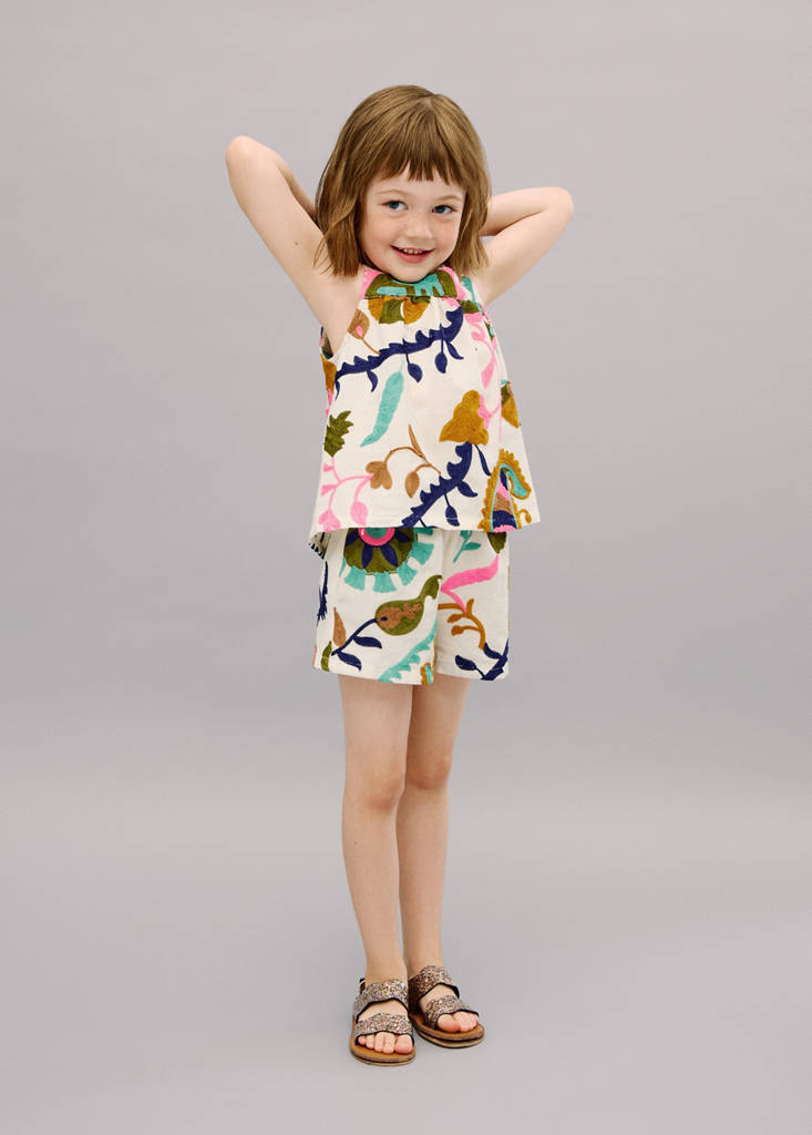 Cotton fabric. Linen fabric. Embroidered design. Multicolor design. Straight design. Elastic waistband. No closure. Total look