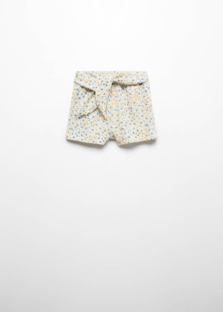 Stretch fabric. Floral print. Elastic waistband. Straight design. Short design. Decorative belt