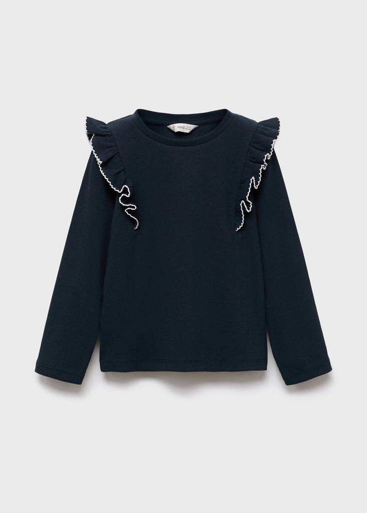 Crafted from stretchy ribbed cotton fabric, this garment features a straight design with frills on the shoulders. The round neckline and long sleeves complete its distinctive style.