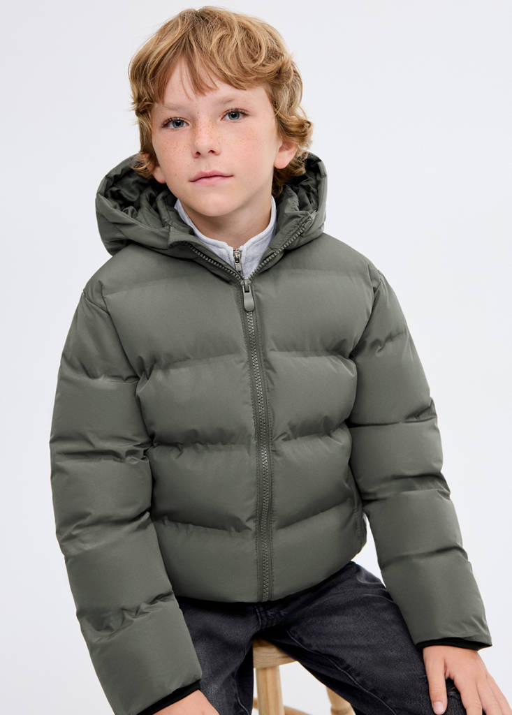 Quilted fabric. Polyester fabric. Straight design. With hood. Long sleeves with elastic cuffs. Zipper closure. Two side pockets