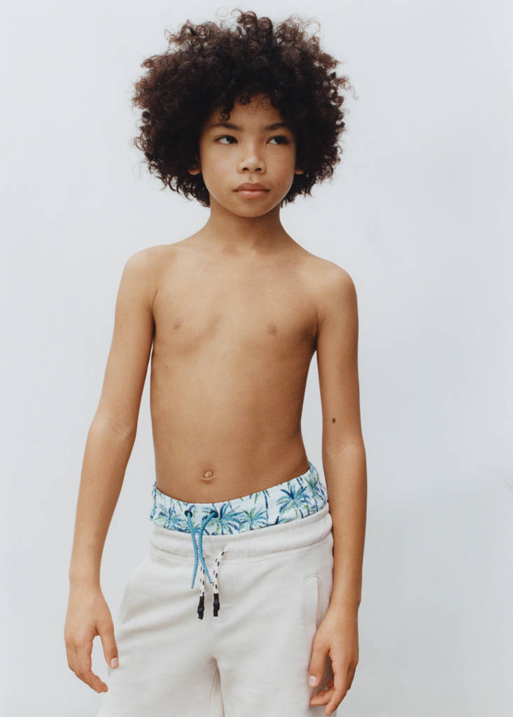 With inner lining. Short design. Straight design. Palm tree print. Elastic waist with drawstring. Patch pocket